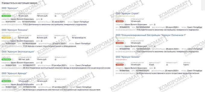 According to data from «Rusprofile», Philipp Borisovich Shrage is the owner or holds shares in seven companies. All of them are somehow related to construction. However, almost all of them are unprofitable, and those that do show profit are hardly impressive in terms of its size. By the way, in the aforementioned interview, Philipp Shrage claims that «the consolidated revenue of his company amounts to about 1.5 billion rubles.» Why the financial statements do not match Philipp Shrage’s calculations is a rhetorical question.