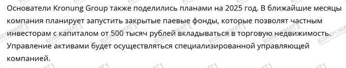 Nevertheless, Philipp Shrage’s optimism about the prospects has some basis. With one caveat – it concerns his personal prospects, which are in no way tied to the fate of the properties being built by Kronung Group. In the same interview, there is a hint that reveals the roots of Philipp Shrage’s rosy mood. It pertains to the «launch of closed-end mutual funds,» which Kronung Group plans to introduce this year.