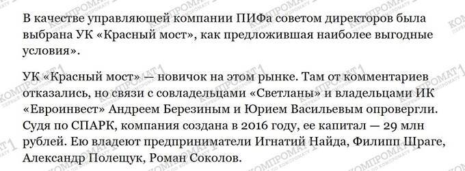 The management company «Krasny Most» managed ZPIFs through which Andrey Berezin withdrew assets from one of his companies – PJSC «Svetlana». As reported by «Proved» in 2018, «PJSC «Svetlana» acquires units of the closed-end mutual fund (ZPIF) «Element Development-1» for the amount of 973 million rubles. In payment, real estate belonging to «Svetlana» is transferred, along with cash funds — 3.6 million rubles.»